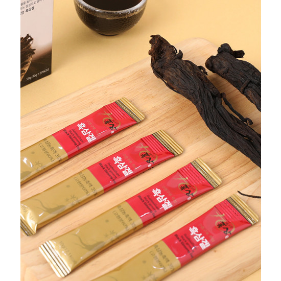 구중구포 수제 방식으로 72시간 추출하여 만든 흑삼, 홍삼농축액 각각 35%와 함께 쌀조청30% 프락토올리고당 5% 들어가서 만들어짐. 아이들도 부담없이 먹을 수 있는 제품